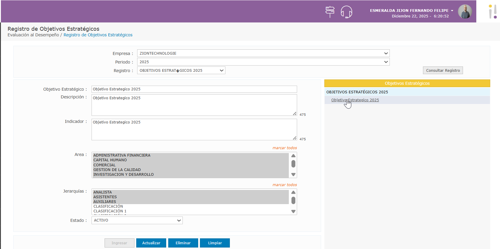 Asociar el objetivo a las Áreas y Jerarquías de la empresa a las que aplica.