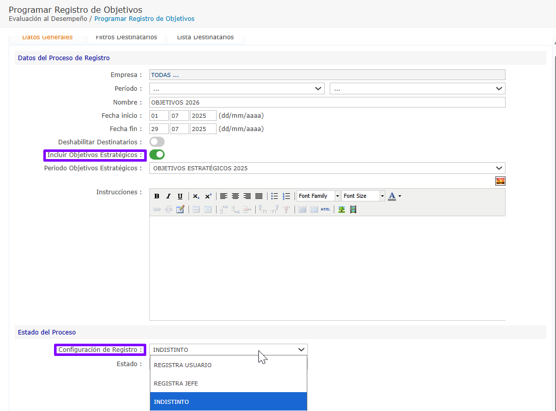 Crear la Programación de Registro de Objetivos y activar la opción "Objetivos Estratégicos".